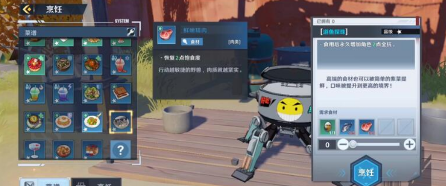 烹饪这个料理的配方为:1变异之卵+5小蓝脊银鲈鱼+5鲜嫩精肉