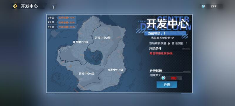 这些区域里除了1号区域是初始就开启的,其余的区域都需要通过升级开发中心来解锁。