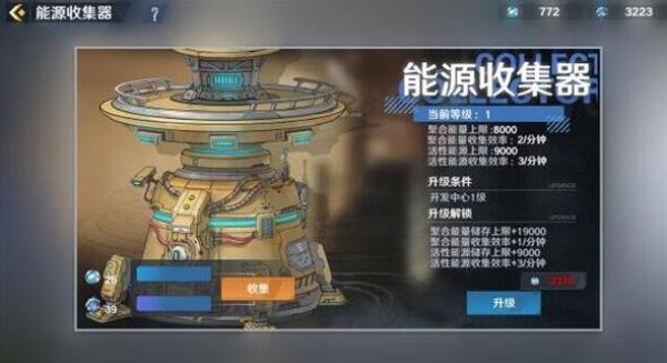 通过升级能够直接提升能源收集器储存上限以及收集的速度,升级是需要用到[聚合能量]的,同样也是在能源收集器处进行收集的。