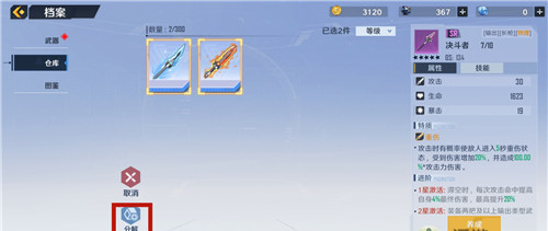选中你想要分解的武器,点击分解。(武器被选中时会有黄色边框)