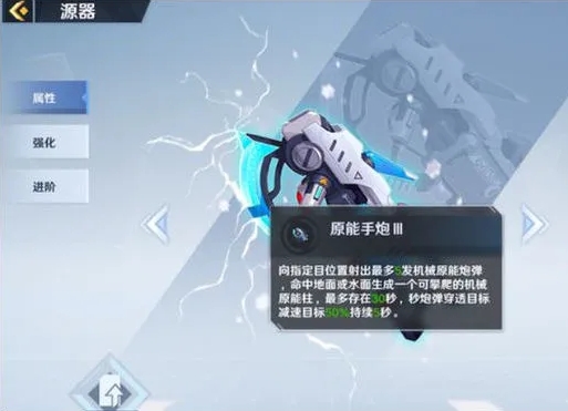 原能手炮可以向指定目标位置射出最多5发机械原能炮弹,命中地面或水面会形成一个可攀爬的机械原能柱,最多存在30秒,炮弹穿透目标减速目标50%并持续5秒,从游戏介绍来看原能手炮还是非常强悍的,在没有机械手臂这个高端源器时,想要登高但喷气背包弹射高度不够怎么办呢?这时就可以靠原能手炮人工制造地形了。仅仅需要一些简单技巧,上手并不难,巧妙地使用可以帮助我们及时脱离战场。