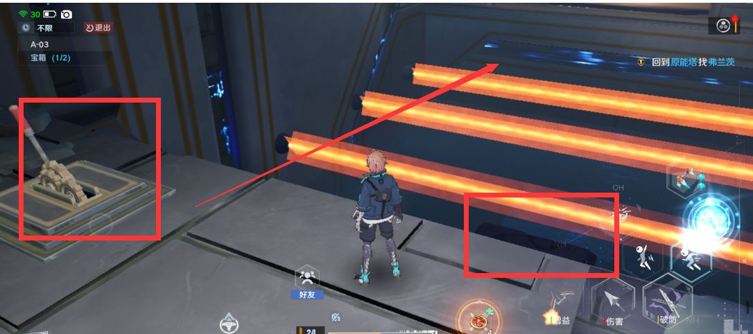 A03的boss是电抵抗属性的,我们可以使用物理伤害和火系伤害去攻击他。他有一个全屏的雷电机制,我们只要站在四角的高台上就行了。这里给出一个办法,就是直接站在四角的高台上面射击他即可。