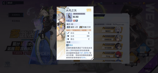【冰风之矢】为强攻系武器,武器特质为寒冰,在武器充能值满后下次攻击可以冰冻敌人并造成冻伤效果。冰冻破碎时造成高额伤害,另外,目标被冰冻期间,武器充能值获取速度降低50%。弓箭增加的属性为攻击、生命和暴击,提高角色生存能力的同时,进一步增强伤害。