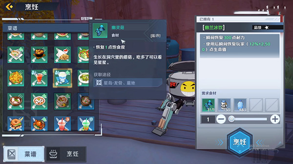 2、还可以使用幽灵菇制作幽兰冰饮,来恢复300点耐力以及(12%+2,500)点生命值。
