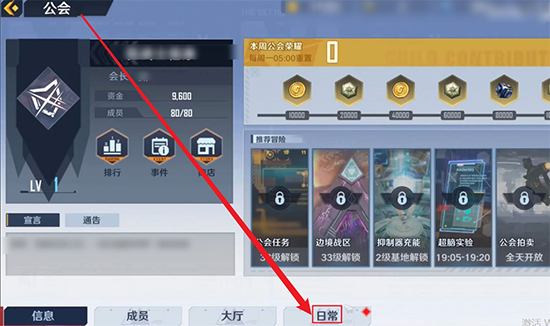 首先,我们点击游戏界面右上角的“公会”项目,进入相关界面。在右下角的“日常”栏上有一个红点,点击进入。