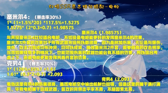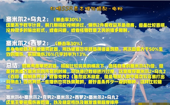 2.塞米尔4件套的效果对于所有武器来说所以都很高,因为是附加伤害,无论是与爆伤,增伤,攻击力加成均布冲突,均可以成算,唯独塞米尔2件套,需要极高的攻击频率。当然如果怪物多的情况下,也能范围伤害的武器也能会有不错的效果,所以综合考虑之下,还是电枪更能发挥其两件套的效果。
