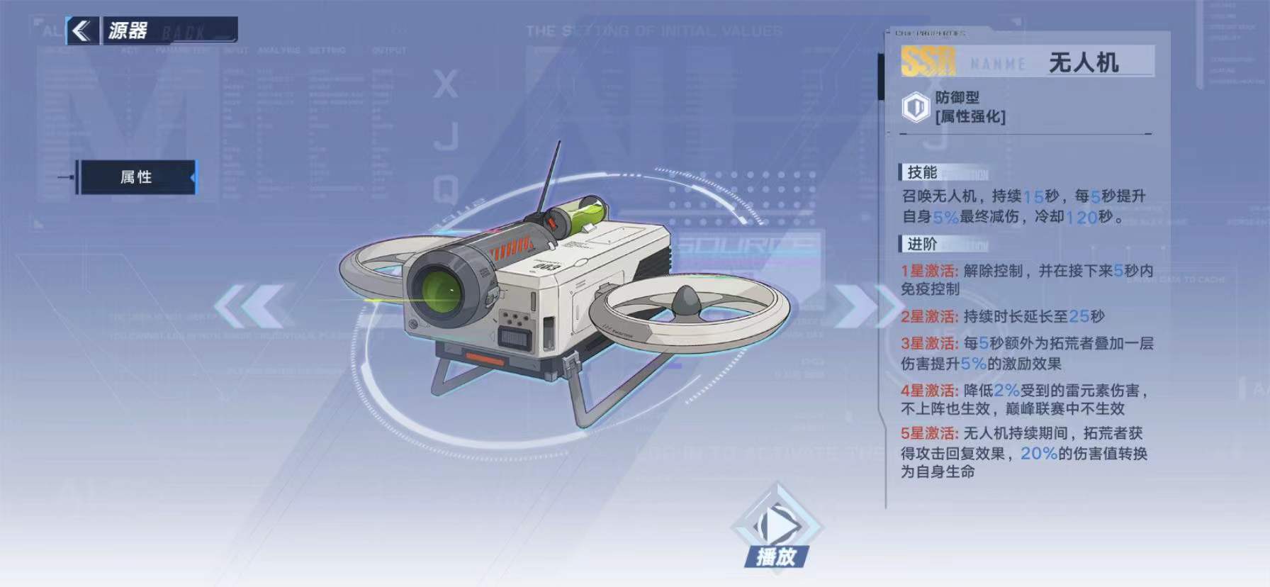 5星激活:无人机持续期间,拓荒者获得攻击回复效果,20%的伤害值转换为自身生命。