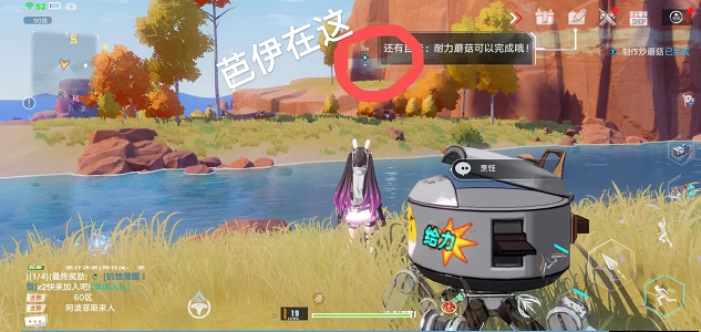 3、采集完回去找芭伊,然后再去找烹饪锅制作“炒蘑菇”,背对芭伊往左前走一段距离,在河对岸就可以找到烹饪锅;