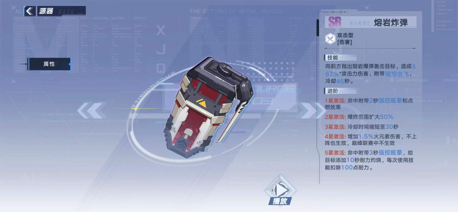 我们通过技能发现,这款sr拿到手就能用,五倍的范围伤害加上控制击飞很不错,1星激活后算是一个小质变,附带了两秒的强控眩晕以及点燃效果,点燃效果面对高血量的敌人时尤其好用,下一个质变就是5星了,控制变成了三秒,还附带耐力灼烧,pvp里对手来这么一下那真要哭死。