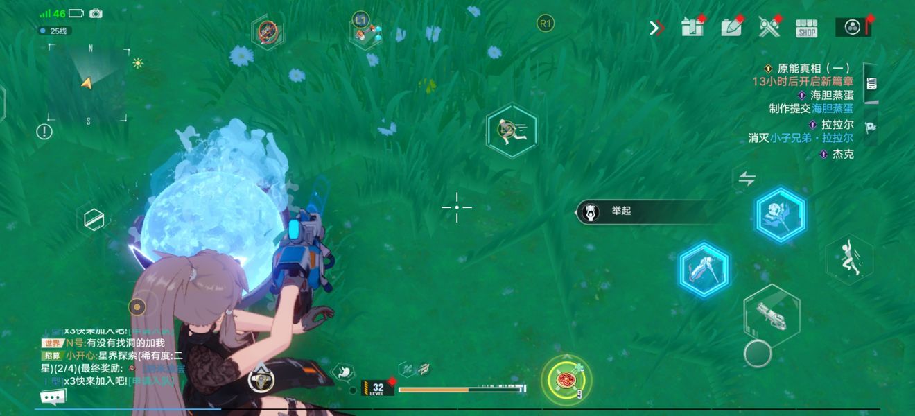 3.站在冰球旁边,保证屏幕上有举起这个按钮,使用原能手炮对准脚下。