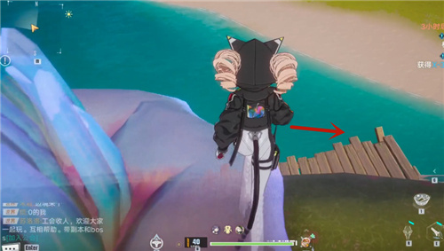 1.首先从吃吃花这里往外跳。跳到这个木板构成的平台之下。