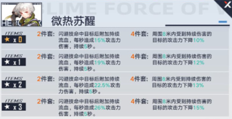 2件套:闪避技命中目标后附加持续流血,每秒造成15/19/22.5/26%攻击力伤害,持续5秒。