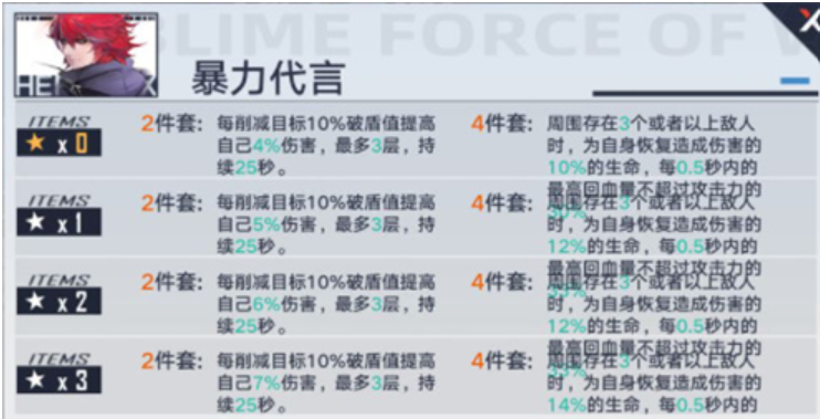 2件套:每削减目标10%破盾之提高自己4%伤害,最多3层,持续25秒。