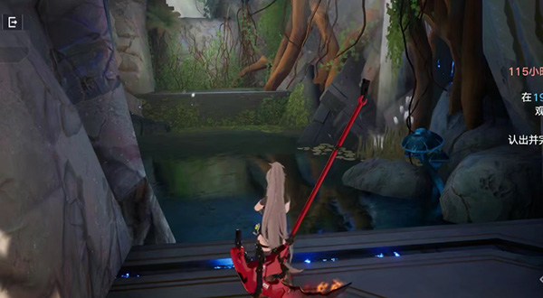 8、拿完宝箱之后,往左走,开启机关,水面上的浮石就会移动,第六个宝箱在水池下面需要下去开启;