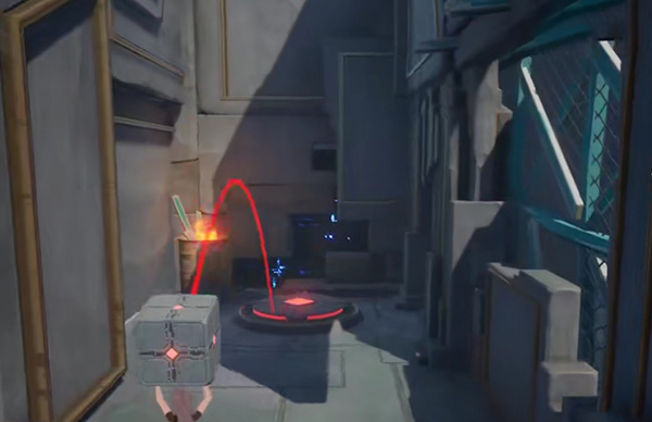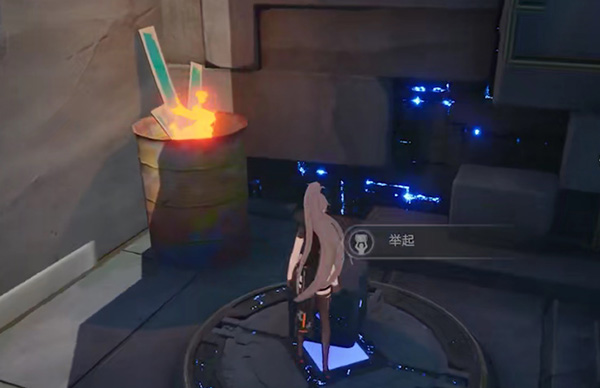9、进入之后,将其清理之后,将旁边的机关举起,正对面房间的右侧房间走,会有一个圆形机关,将方块机关扔上去;