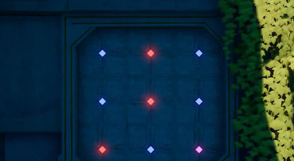 5、之后继续往前面走会进入下一个房间,就是九宫格,在九宫格房间中,正前方会有一个图案,按照图案的样子去踩地上的九宫格,左侧的大门就会打开;