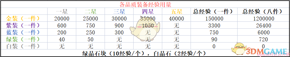 由上图可知,金装一件的总经验是紫装的45倍之多。