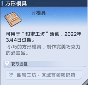 获取方法:甜蜜工坊活动期间,击败区域首领可以获得首领密码箱,打开密码箱可以获得方形模具。