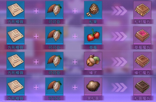 获取到方形模具之后,加入巧克力食材就可以获得【可可魔方】菜谱,加入其他食材还可获得更多巧克力甜品。