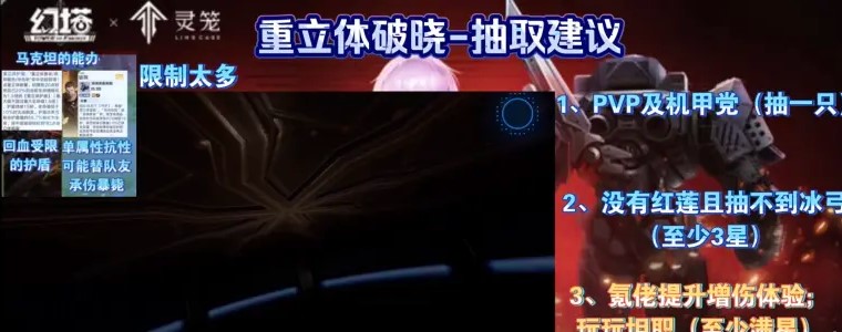 1.喜欢开机甲和pvp的玩家,可以抽一个马克。因为一个马克就可以体验到重立体的所有体验;而马克目前的强控免控也是pvp必备的武器,所以pvp玩家也建议抽取一个。
