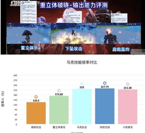 介绍完这些,想必大家对马克的输出能力也有了一个大致了解,这里up再介绍一下目前马克作为输出的主要输出流程:开局马克开技能上重立体、之后就切增伤武器上buff后切主c武器输出,主c爆发完后,切马克砸三下地板,再放重立体技能续盾,之后再切增伤武器如此循环即可。