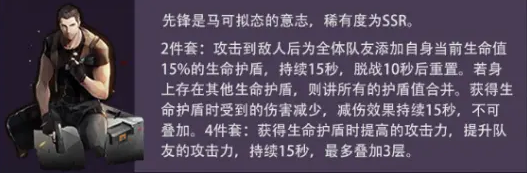 意志套装效果:2件套:攻击到敌人后为全体队友添加自身当前生命值15%的生命护盾,持续15秒,脱战10秒后重置。若身上存在其他生命护盾,则讲所有的护盾值合并。获得生命护盾时受到的伤害减少,减伤效果持续15秒,不可叠加。该意志效果后台也生效,装备多套生效最高星级。4件套:获得生命护盾时提高的攻击力,提升队友的攻击力,持续15秒,最多叠加3层。该意志效果后台也生效,装备多套生效最高星级。