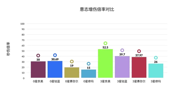 那我们就来到意志强度测试环节,up将赛弥尔、钴蓝、修玛、红莲两件套效果与奈美西斯的四件套效果进行对比,经过测试与计算可以得到以下数据: