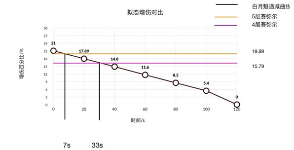 从上图数据我们可知:在7秒的时候,白月魁就已经比不过赛弥尔的增伤带来的提升了,并且短短33秒就比不过赛弥尔叠4层效果了。