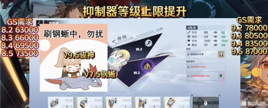 抑制器开放到了9.5,同时等级上限也来到了80级,8.5可以获得最后一个位置的西萝意志,而9.5最高级抑制器可以随机获得一个金引擎,所以按照钢蜥俊神理论来说,7.5将成为新钢蜥,9.5才是我们的俊神大圆满了。且最高的9.5抑制器需要战力也来到了8.7万,新装备拉满属性加的还得多点应该才能触碰到这个境界了;