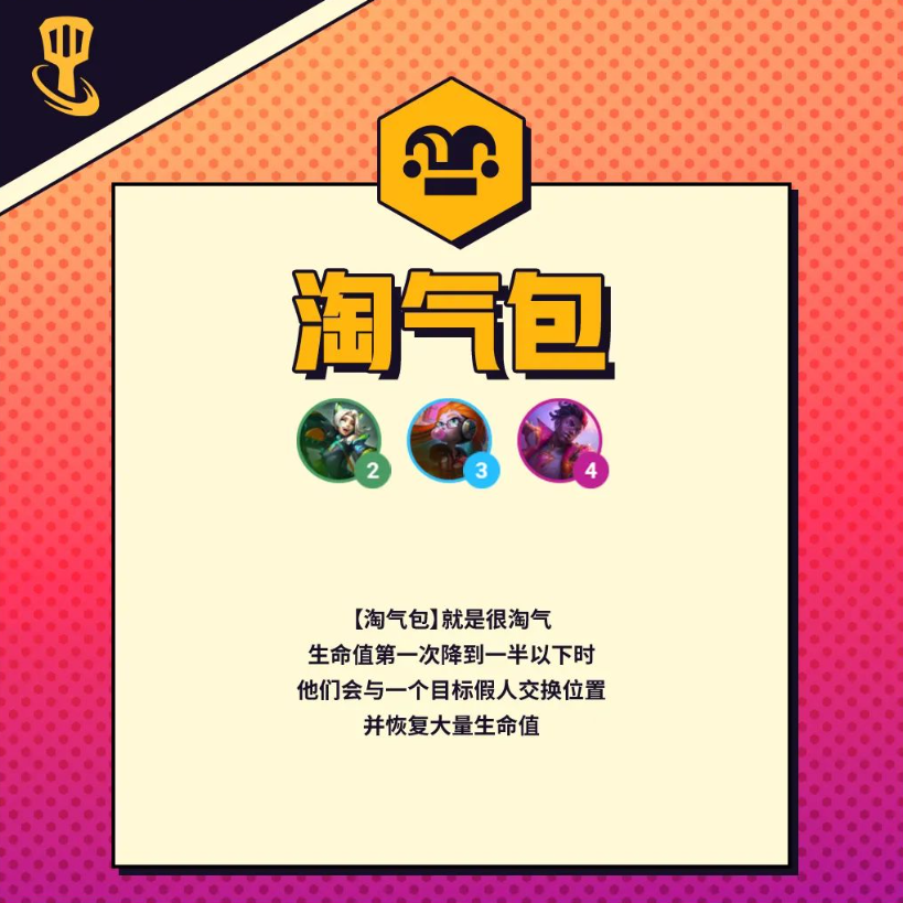 s8赛季马上就要到来了,大家一定都很期待吧!淘气包是金铲铲之战S8怪兽来袭新增羁绊之一,在血量降到50%以下时会与一个目标假人交换位置,那么金铲铲之战淘气包羁绊什么效果呢?下面就让小编为大家介绍一下,一起来看看吧。