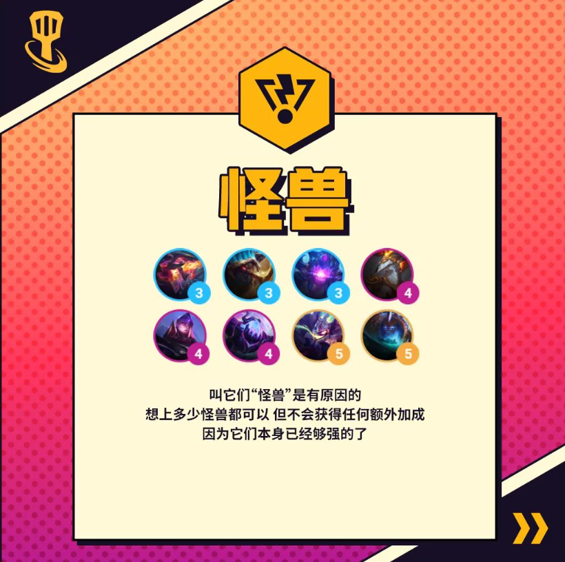 怪兽羁绊算是一个不完全算羁绊的羁绊,弈子不会有别的羁绊效果,而且他们不会因为队里其他反而获得增益。作为补充,所有的弈子会异常强大。