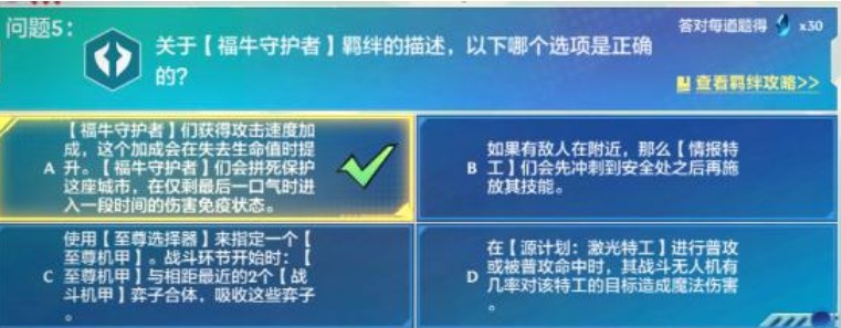 答案:A.【福牛守护者】们获得攻击速度加成,这个加成会在失去生命值时提升。【福牛守护者】们会拼死保护这座城市,在仅剩最后一口气时进入一段时间的伤害免疫状态。