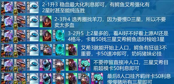 3.运营思路:2-1升3在稳血的同时实现最大化利息;2-3升4找羊刀,但是不要为装备去卖血,因为是中期提速阵容血量很重要;艾希3星后上人口,鳄鱼看情况3,最后8人口慢d三星。