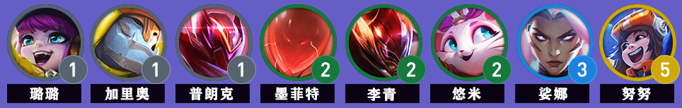 1.阵容组成:【璐璐、加里奥、船长、石头人、盲僧、猫咪、琴女、努努】;