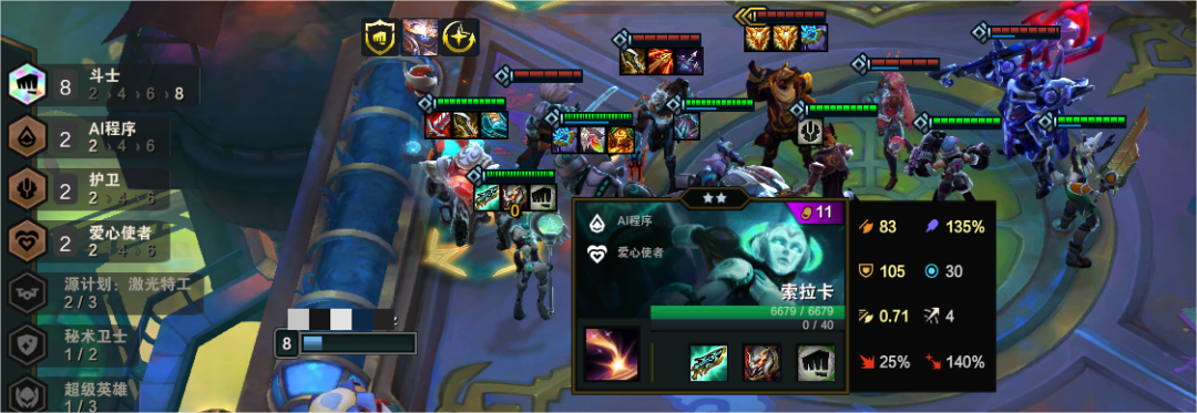 4-5或5-1拉8后,D牌找一张猪妹和索拉卡完成8斗2AI的标准阵容,然后再慢慢在8级追武器3星以及猪妹和索拉卡2星,锐雯来得多也可以顺带追一下,3星后继续存钱拉9,补橙卡质量提升阵容上限即可。