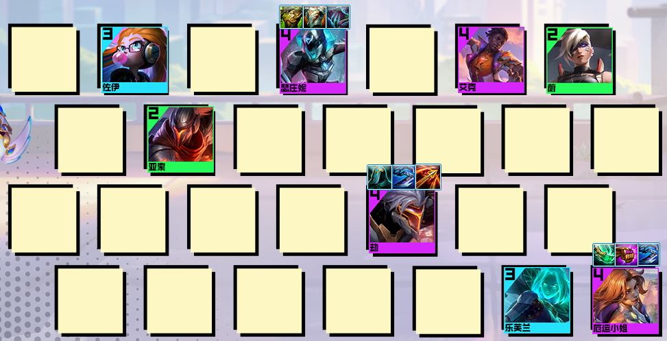 后期阵容:8人口大搜找到2星劫、厄运小姐以及前排的瑟庄妮。补充佐伊和乐芙兰开出3黑客羁绊。佐伊有淘气包羁绊,可以放在前排吸引火力。