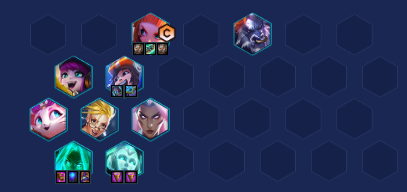 前期用三小天才+拉克丝过渡,五人口可以补护卫,如果有娑娜或者地下魔盗团来得早也可以用魔盗团过渡,中期搜到二星娑娜和二星阿利斯塔后稳血上人口补五费卡即可