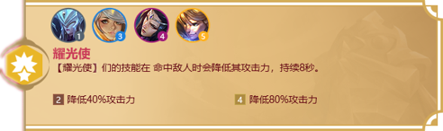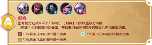 效果:在战斗环节开始之前,[刺客]们会跳到敌方后排,[剌客]们的技能可以暴击,并且他们会获得额外的暴击伤害和暴击几率。