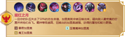 效果:三国猛将有额外的生命值和法术强度,他们在登场后每打赢一场战斗,就会使这个额外加成提升10%,至多可叠加5次。