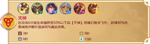 效果:在攻击6次或生命值跌到50%以下后,天神会飞升,获得40%伤害减免和额外40%真实伤害。
