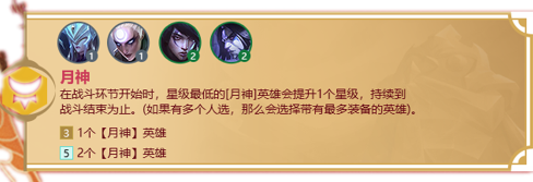 效果:把星级最低的月神英雄增加1星,如果等级一样那么就选装备最多的。