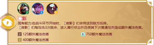 效果:开局跳到敌方后排。夜影每攻击3次就会浸没入暗影之中,下次攻击造成额外魔法伤害。