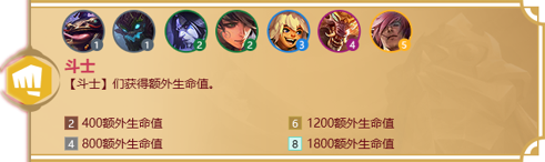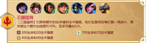 效果:三国猛将有额外的生命值和法术强度,他们在登场后每打赢一场战斗,就会使这个额外加成提升10%,至多可叠加5次。