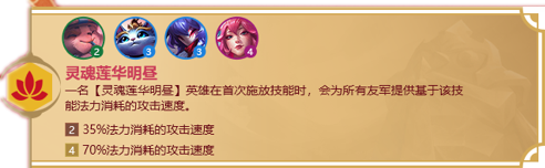 (4) 所有友军获得20%法术强度,灵魂莲华·夜幽英雄们获得额外40%法术强度