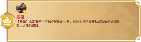 效果:固有能力: [枭雄]会部署两个可独立移动的士兵。这些士兵会跟着他们的主人一起施放技能,并在他们的主人阵亡后急速损失生命值。