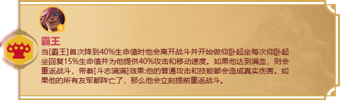 效果:当[霸王]首次降到40%生命值时,他会将自已移出战斗并开始做仰卧起坐。每次仰卧起坐回复15%生命值并为他提供20%攻击速度。如果他达到满血则会带着I斗志满满]效果重返战斗,使他的普通攻击和技能伤害转化为真实伤害。如果他的所有友军都阵亡了,那么他会立刻提前重返战斗。