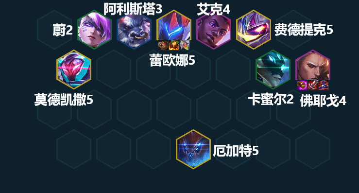 阵容组成:蔚、阿利斯塔、蕾欧娜、艾克、费德提克、莫德凯撒、卡蜜尔、佛耶戈、厄加特