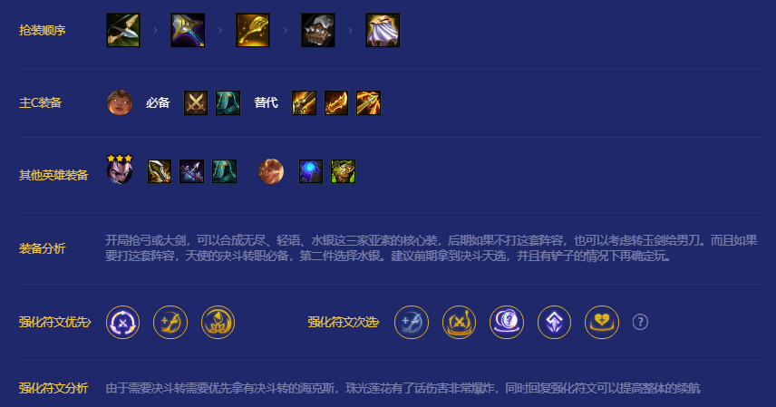 开局抢弓或大剑,可以合成无尽、轻语、水银这三家亚索的核心装,后期如果不打这套阵容,也可以考虑转玉剑给男刀。而且如果要打这套阵容,天使的决斗转职必备,第二件选择水银。建议前期拿到决斗天选,并且有铲子的情况下再确定玩。