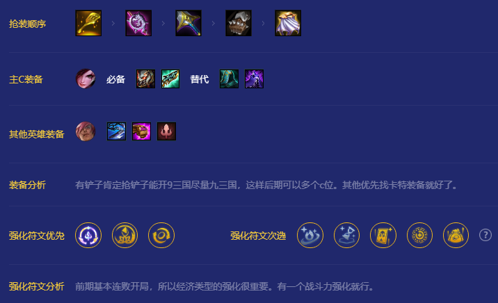 有铲子肯定抢铲子能开9三国尽量九三国,这样后期可以多个c位。其他优先找卡特装备就好了。
