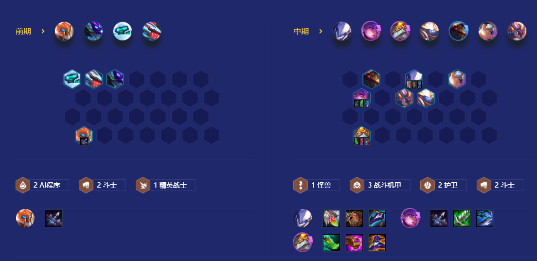开局优先用反曲之弓或者拳套; 优先合成最后的轻语或者日炎斗篷; 追求三星英雄:卑尔维斯>索尔>瑟提; 2-1升四人口,优先用斗士+AI连胜开局,有最后的轻语或者日炎斗篷可以直接合成,总体运营思路和机甲精英相似; 2-5升五人口,优先补德莱文开精英战士,由于前期我们需要合成最后的轻语,而后排输出比较契合轻语的英雄就是德莱文/希维尔/赛娜等; 3-2升六人口,优先补任意的怪兽单卡即可,并且需要小搜一波找到二星德莱文/希维尔/赛娜等输出位,怪兽单卡可以根据阵容质量来决定,如果缺少前排就补拉莫斯,缺少输出就补维克兹或者索尔; 4-1升七人口,优先开三战斗机甲搭配两个怪兽前排即可,因为二星的机甲德莱文输出会比一星的卑尔维斯稳定,并且输出装备也要给予德莱文即可; 5-1升八人口,大搜一波找到基础的阵容体系,这里需要注意的是要找到二星的瑟提以及二星的卑尔维斯或者索尔,这样才可以保证自身的输出能力,如果找不到高费怪兽单卡也可以先补拉莫斯或者维克兹进行过渡; 后续上九人口优先补费德提克和莫德凯撒即可,主要是利用莫德凯撒的减抗机制来削弱敌方的坦度,让索尔的技能伤害可以更高,同时补上厄加特和费德提克的控制更是可以让卑尔维斯输出更稳定